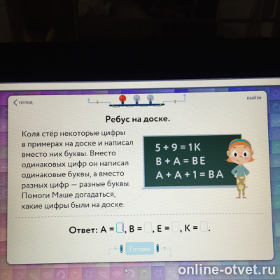 ребус на доске .Коля стер некоторые цифры на доске и написал вместо них буквы . Ответ . Ответ дан dashakovtun27 . 5+9=14 (K=4) 1+9=10 (B=1, А=9, Е=0) А+А+1=ВА => 9+9+1=19 .