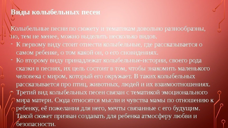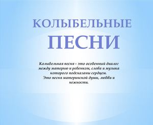 Колыбельные песни — первые музыкальные произведения в жизни ребенка . Умиротворяющие мелодии помогают малышу заснуть, создают ощущение уюта и безопасности, знакомят его с еще неизвестным миром .