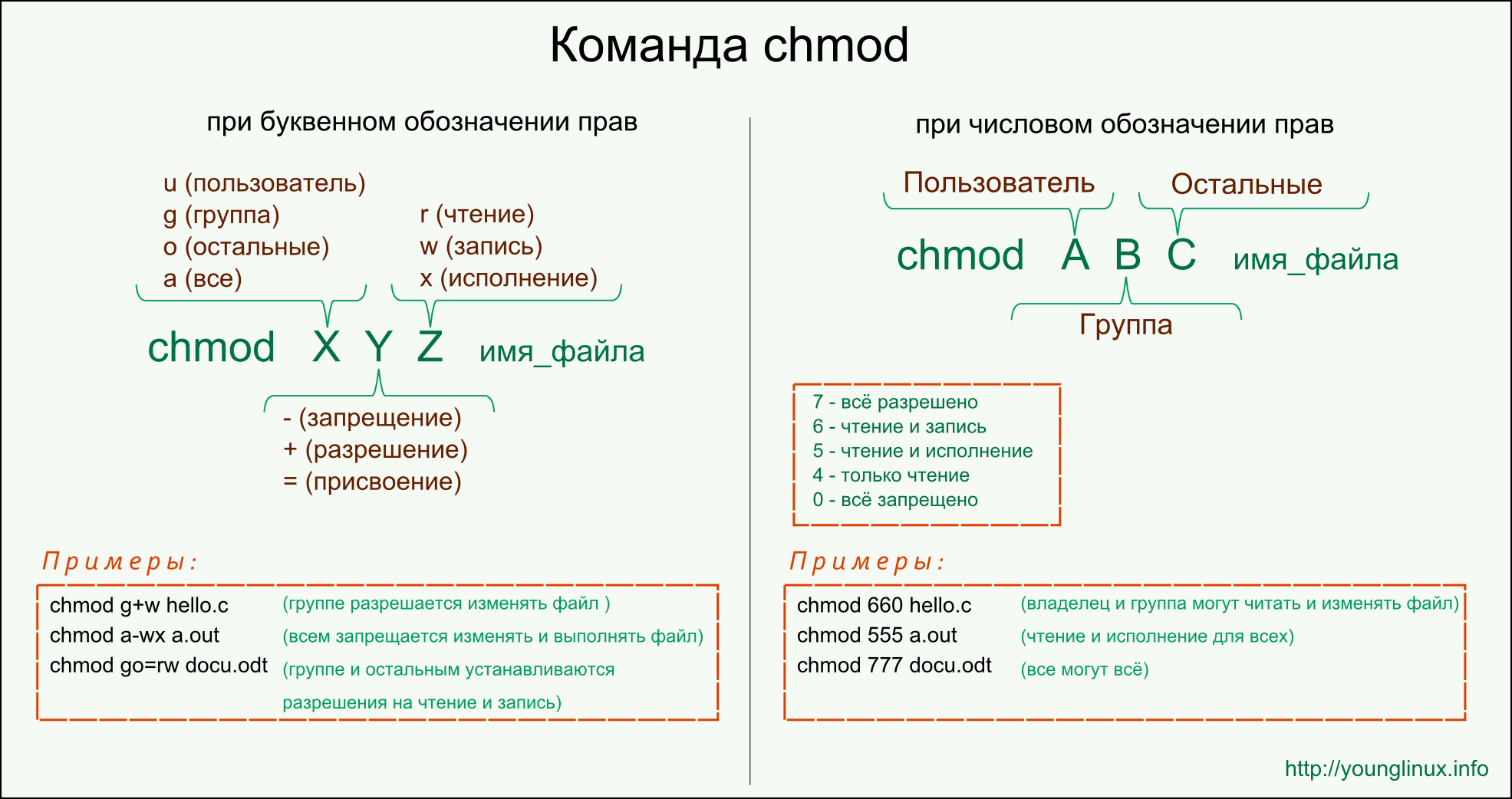 В первом примере файлу назначаются права на чтение и запись для владельца, а для группы и остальных – только на чтение. Во втором примере всем даются права на чтение и запись.