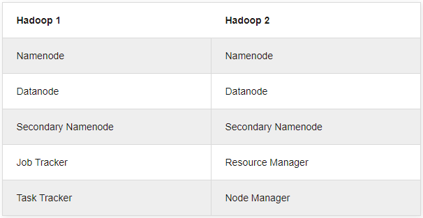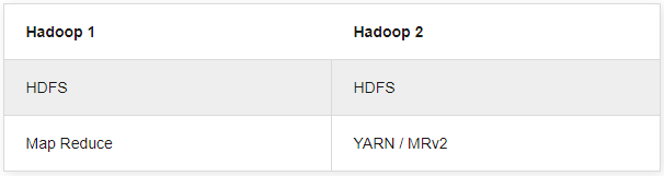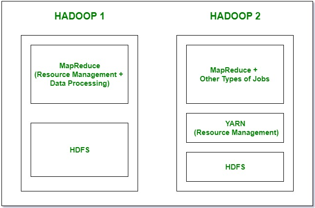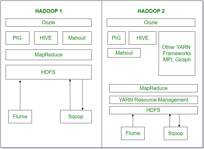 1. Компоненты: в Hadoop 1 у нас есть MapReduce, но в Hadoop 2 есть YARN (еще один посредник по ресурсам) и MapReduce версии 2.