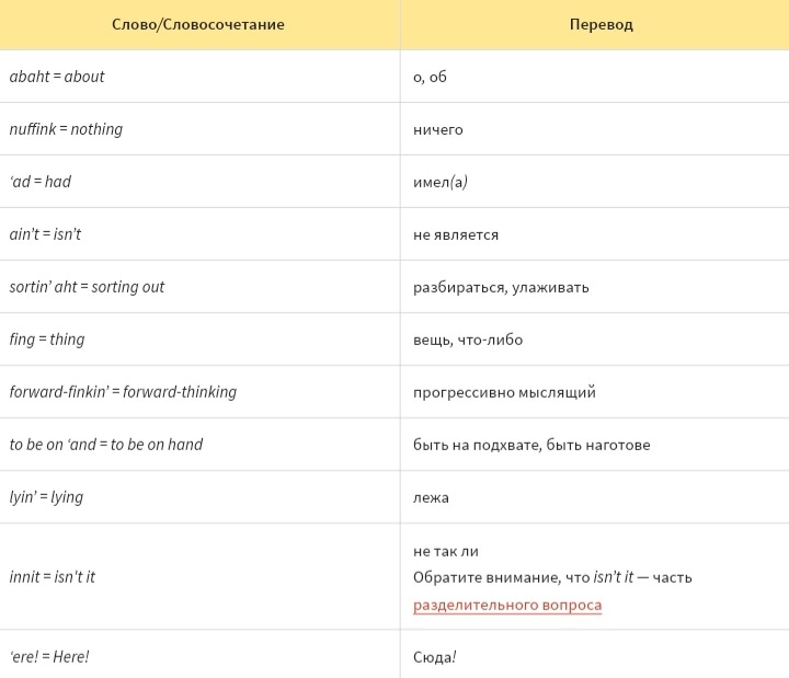 Самое примечательное здесь — многочисленные разговорные формы и просторечия, характерные для малообразованных людей и представителей определенных диалектов (например, кокни).