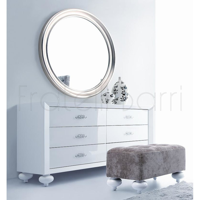 Небольшой вместительный комод «Тиффани 93.19» является частью модульного набора для спальни «Тиффани», его можно использовать как отдельный элемент, так и в сочетании с другими модулями спальни. Ажурная фрезеровка придает комоду изысканность и индивидуальность. Благородный блеск кристаллов Swarovski® выгодно оттеняется глиттерным рисунком. Ножки регулируются по высоте, что позволяет компенсировать возможные неровности пола.