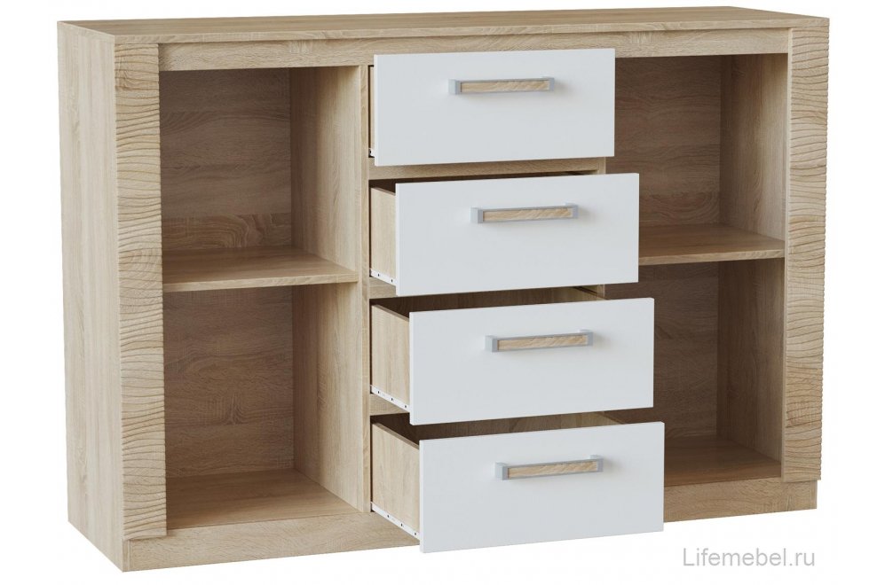 Комод «Мегаполис 55.09» является частью модульной программы «Мегаполис». В комоде установлены четыре выдвижных ящика. Ножки модуля регулируются по высоте, что позволяет при установке комода скорректировать неровности пола.