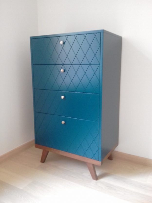 Комод имеет четыре вместительных ящика. Ножки регулируются по высоте, что позволяет установить модуль на любую поверхность и компенсировать возможные неровности пола.