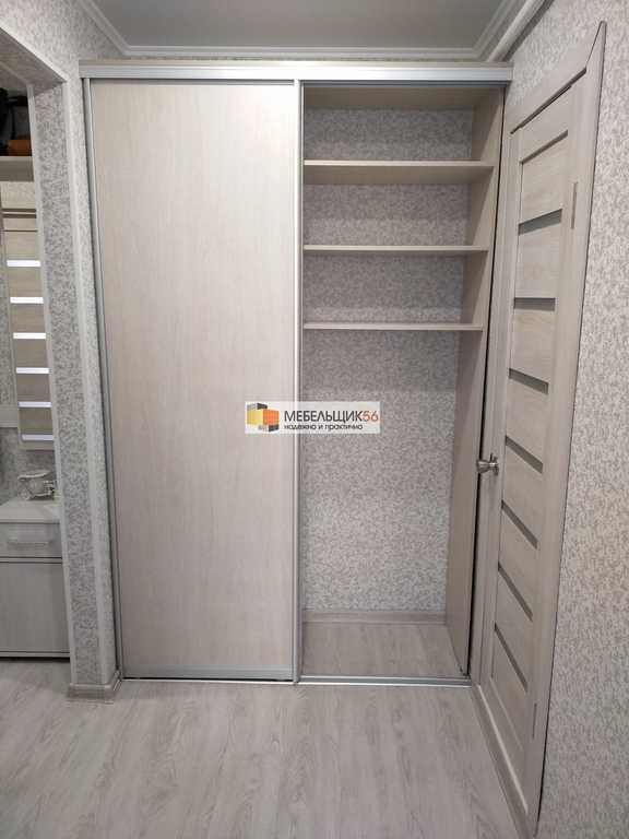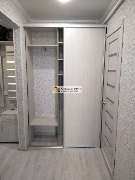 Деревянное покрытие. 6 вариантов гардеробов различных размеров и угловой модуль. Светодиодная подсветка на под...