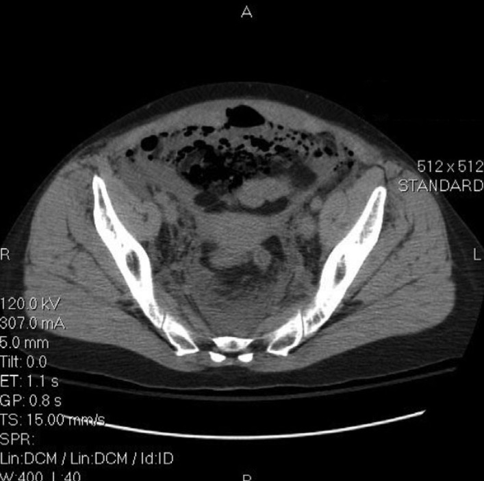 Figure 2. Компьютерная томография брюшной полости и таза, демонстрирующая значительное количество воздуха и жидкости располагающихся внебрюшинно кпереди от мочевого пузыря.