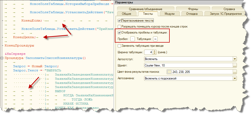 📌 Включи отображение непечатаемых символов в модуле («Сервис - Параметры - Тексты - Отображать пробелы и табуляции»). Это поможет контролировать правильность отступов. А также наличие лишним символов после конца строк. Их наличие - признак дурного тона.