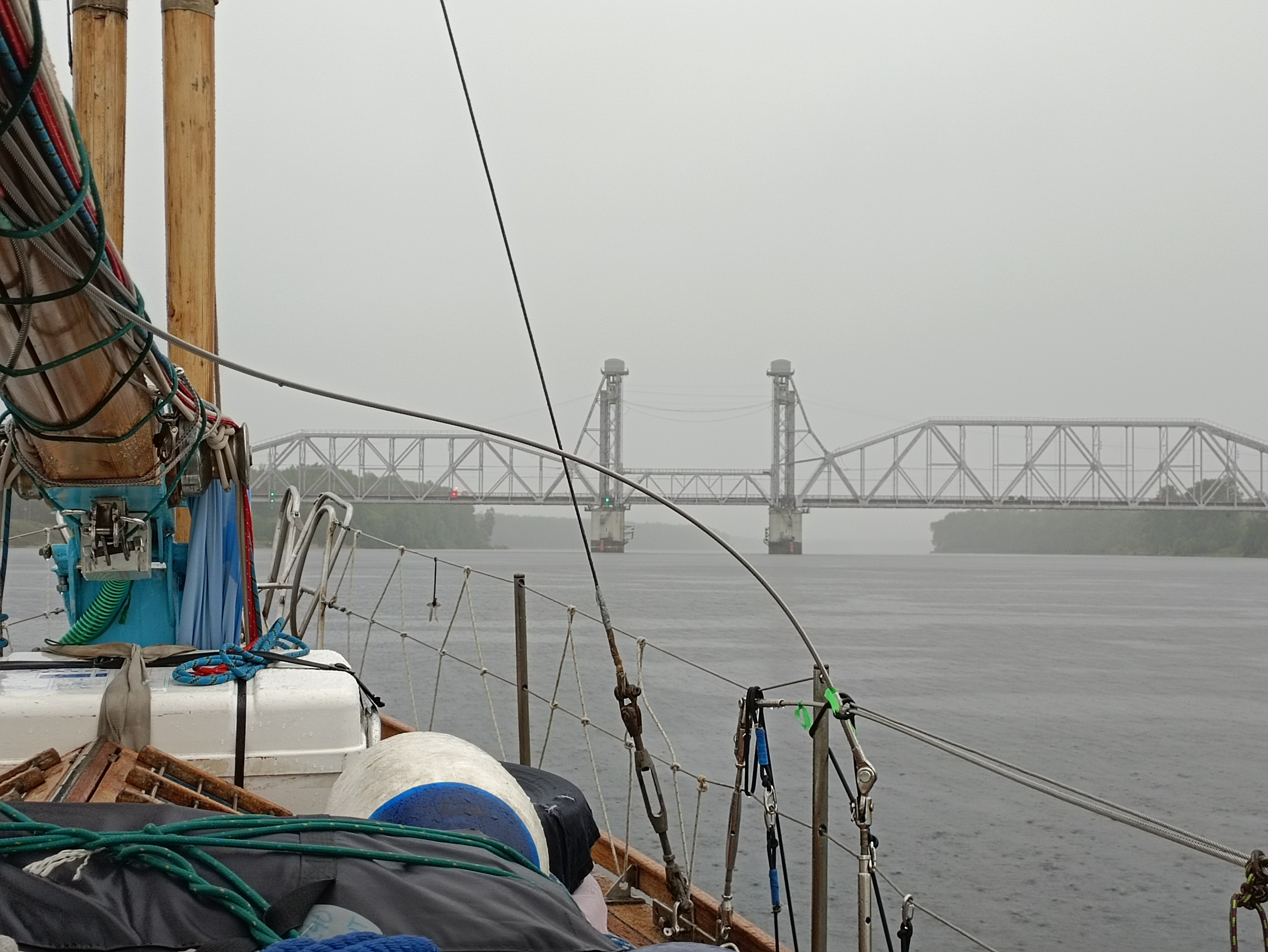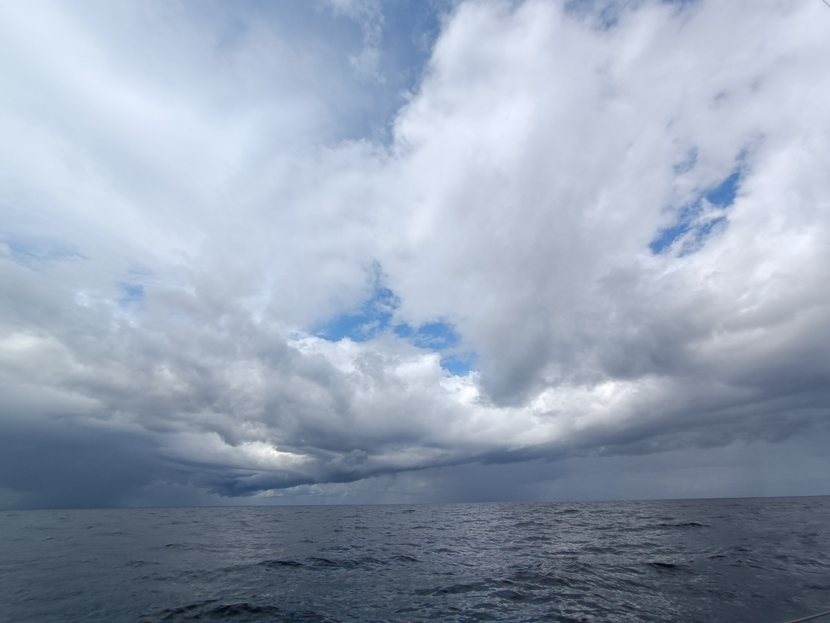 Безуспешно ждем хоть какого-нибудь дуновения получая лишь пару непродолжительных шквалов из проходящих туч. Приходится заводить мотор и дальше брести под проливным дождем без единого намека на ветер.
