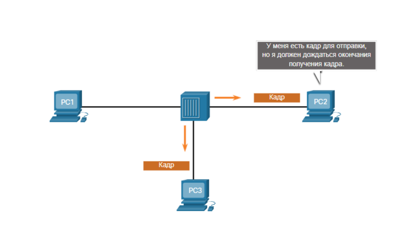 Если другое устройство, например PC2, хочет осуществить передачу, но в данный момент принимает кадр, оно должно дождаться освобождения канала, как показано на рисунке.