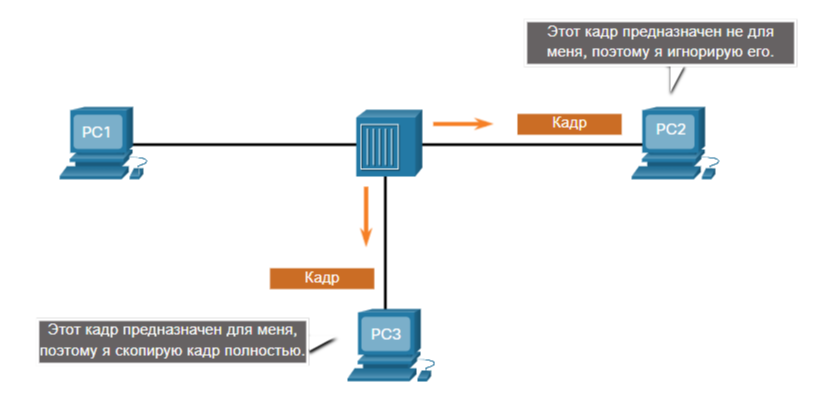Кадр будет доставлен всем устройствам, подключенным к концентратору. Но поскольку в кадре указан адрес целевого канала данных, относящегося к PC3, то только это устройство будет принимать и сохранять весь кадр. Сетевые платы всех остальных устройств игнорируют кадр, как показано на рисунке.