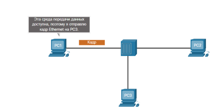 Сетевая плата PC1 отправляет Ethernet кадр, когда среда доступна, как показано на рисунке.