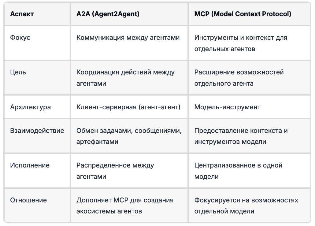 - A2A дополняет MCP, а не конкурирует с ним