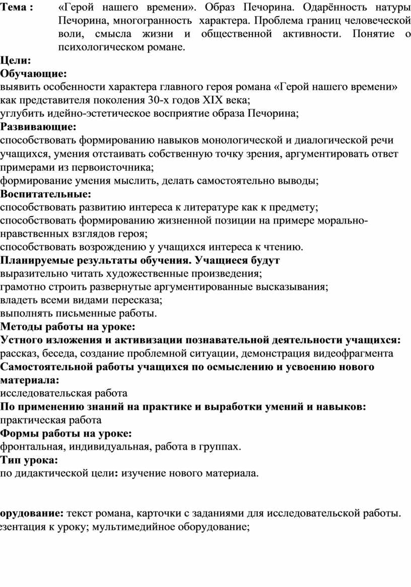 Конспект печорина 9 класс