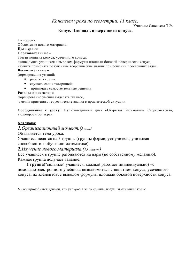 Конспект урока конус 11 класс
