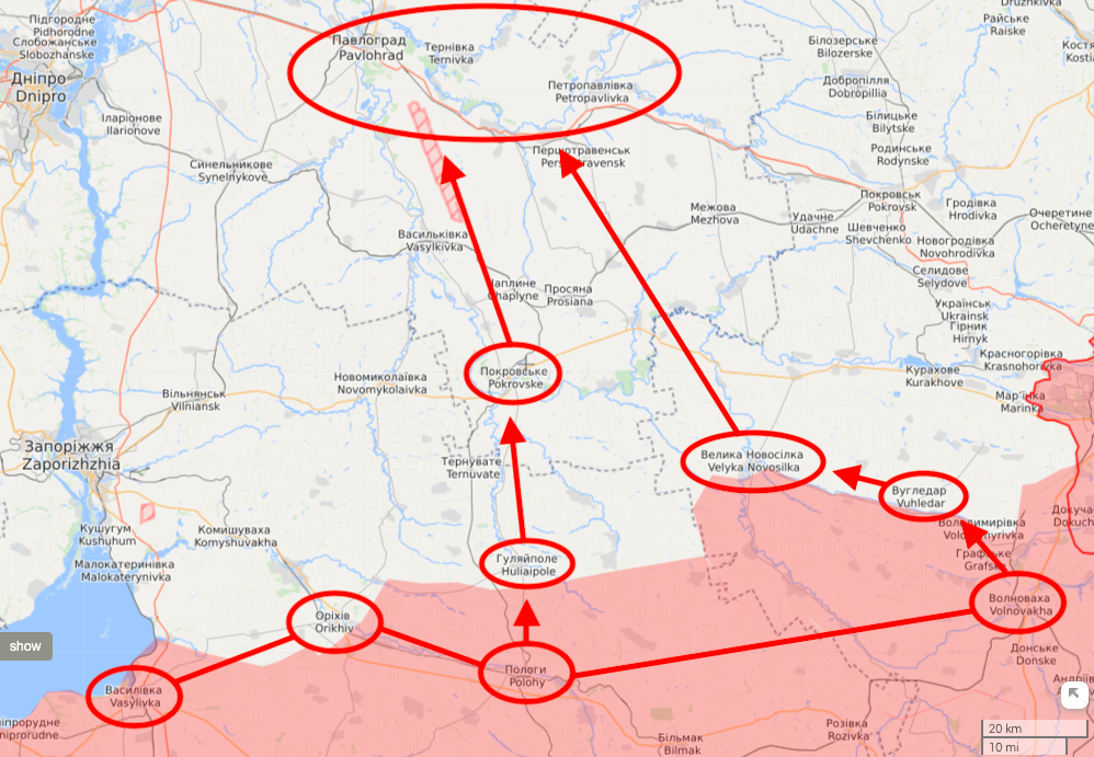 3) На линии Васильевка - Орехов - Пологи - Волноваха противник уже 4-е сутки ведёт "плотные" и достаточно упорные тактические бои с целью создания благоприятных предпосылок для начала широкомасштабной оперативно-тактической наступательной операции. Её смысл состоит в том, что бы двумя ударными тактическими группами одновременно продвинуться от Гуляйполя на Покровск (вероятно имеется в виду Покровское - ШН) и от Волновахи через Угледар в район Великой Новосилки. А затем с этого рубежа "соединёнными силами" прорваться в раойн Павлоград - Петропавловка.
