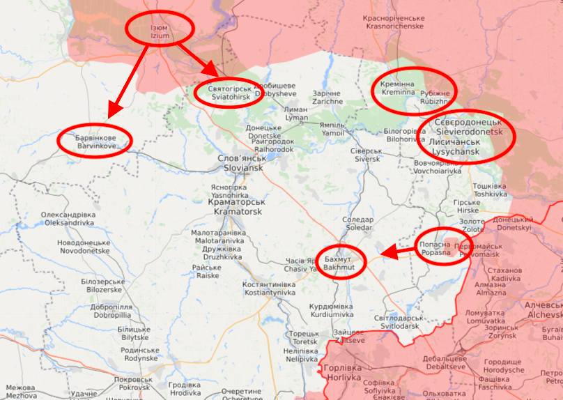 Другими словами, пока в зоне проведения операции ОС повторяется "киевская история". Противник, так же как и под Киевом, при первых же "трудностях" с дальнейшим продвижением, пытается наращивать свои усилия, путём ввода в бой дополнительных сил и резервов (в частности, на изюмском направлении уже отмечается появление подразделений из состава бывшей "киевской группировки", кое-как и наспех "восстановленных"). Однако, помогает это ему достаточно слабо... Ибо объективная ситуация такова, что его ударные группировки должны, говоря по простому... весьма "исхитриться", что бы беспрепятственно и без всяких траблов перейти в наступление... Причём комплекс этих трудностей у них таков, что у командования войск противника в результате постоянно возникают "обстоятельства непреодолимой силы"...