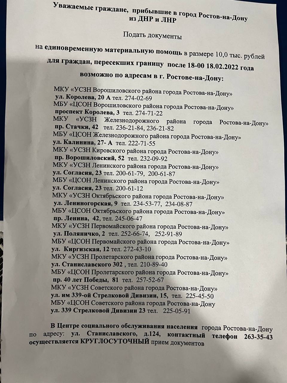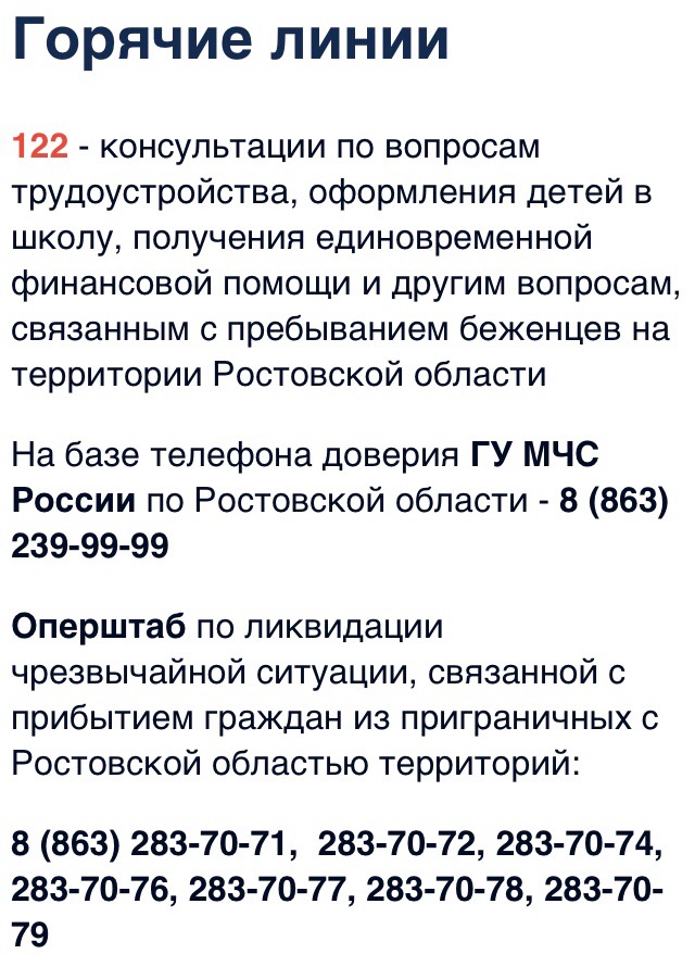 122 (доп.2) - консультации по вопросам трудоустройства, оформления детей в школу, получения единовременной финансовой помощи и другим вопросам, связанным с пребыванием беженцев на территории Ростовской области