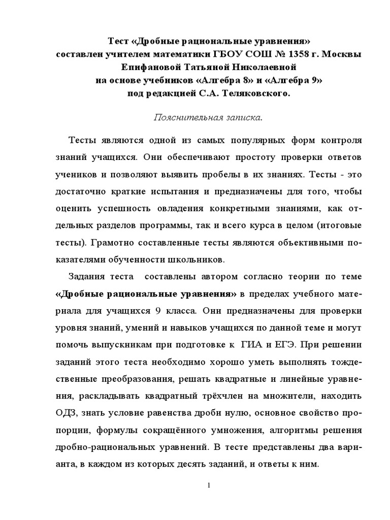 Тест «Дробные рациональные уравнения» - Печатные тесты по . . .