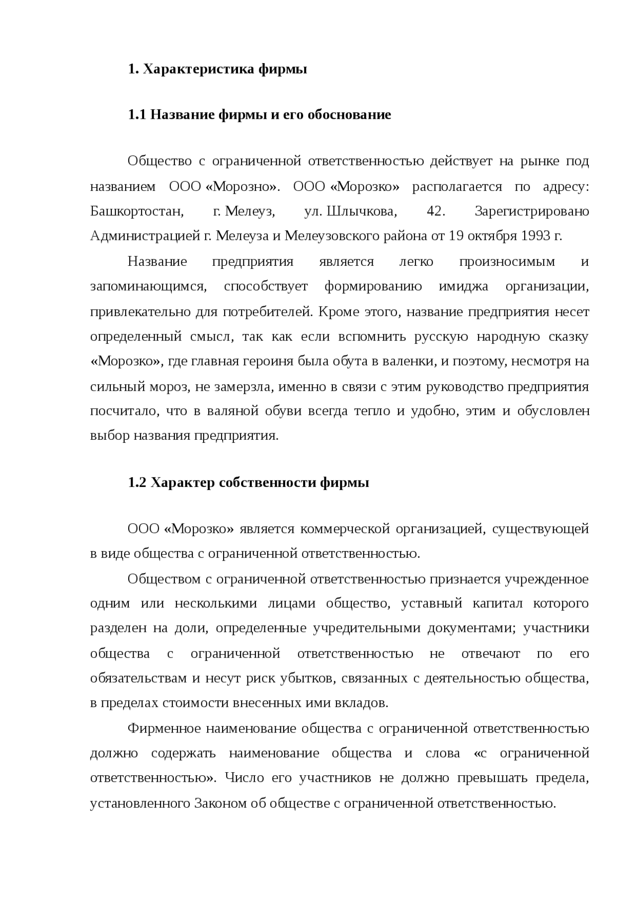 Анализ процесса управления организацией на примере деятельности предприятия ООО "Морозко" Направления деятельности фирмы и характеристика формы собственности .