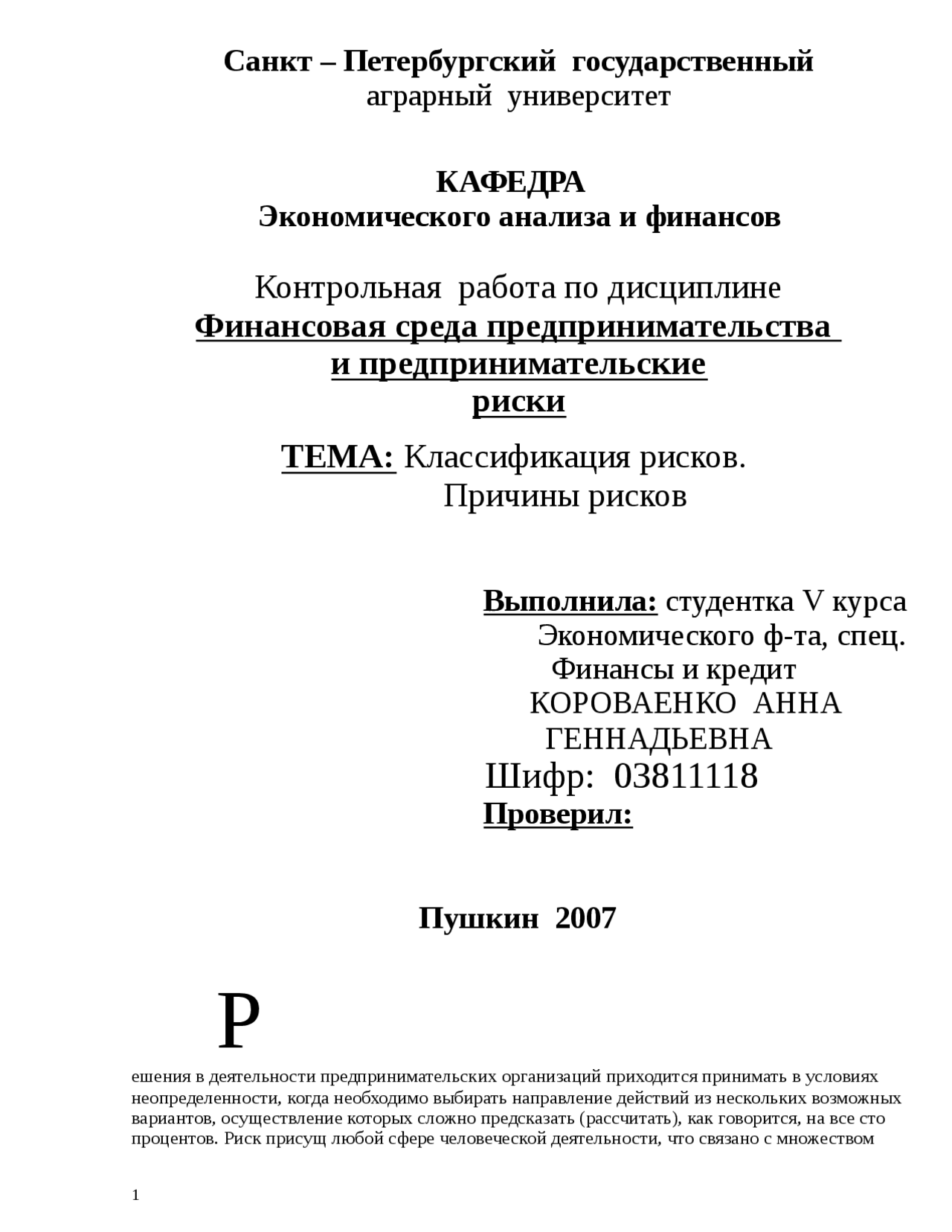 Контрольная Работа На Тему Предпринимательский Риск