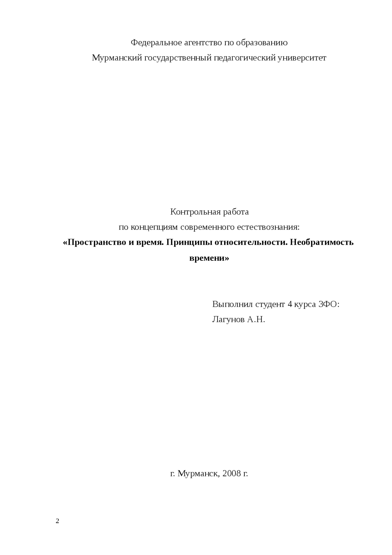 Контрольная работа . по концепциям современного естествознания: «Пространство и время . Принципы относительности . Необратимость времени» Выполнил студент 4 курса ЗФО: Лагунов А .Н . г . Мурманск, 2008 г .