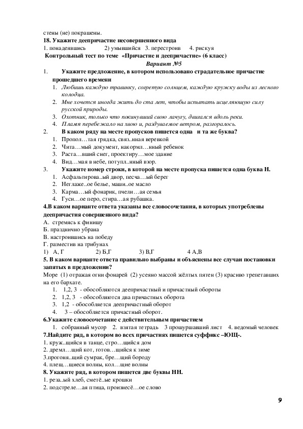 Контрольная работа тема деепричастие