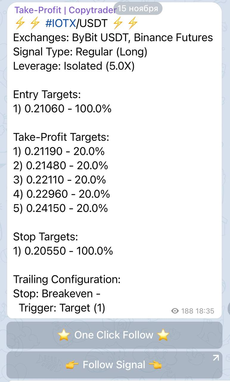 👉 Follow Signal 👈 – ручная настройка сделки перед её выполнением. После нажатия вы попадаете в бота, который задает вам вопросы по типу на какой % от свободных средств будем заходить в сделку, по каким целям выходить и т.д.