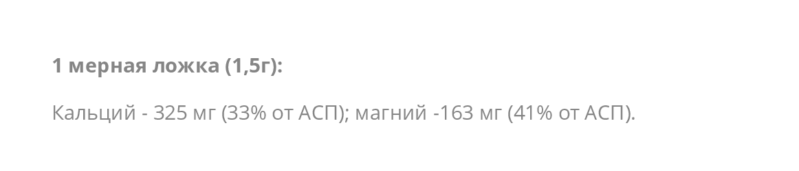 Состав Коралловый Кальций НСП 1 мерная ложка (1,5г): Кальций - 325 мг (33% от АСП); магний -163 мг (41% от АСП) .