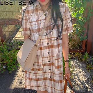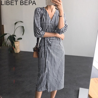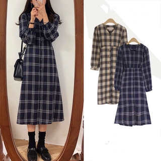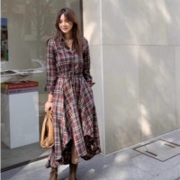 Korean Chic French Minority Spring and Autumn Retro Temperament Waist-Controlled Slimming Mid-Length Plaid Shirt Dress