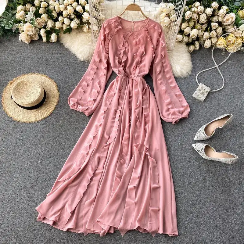 2022 New Women's French Style Platycodon Grandiflorum Pleated Shirt Dress Long Sleeve Dress for Women