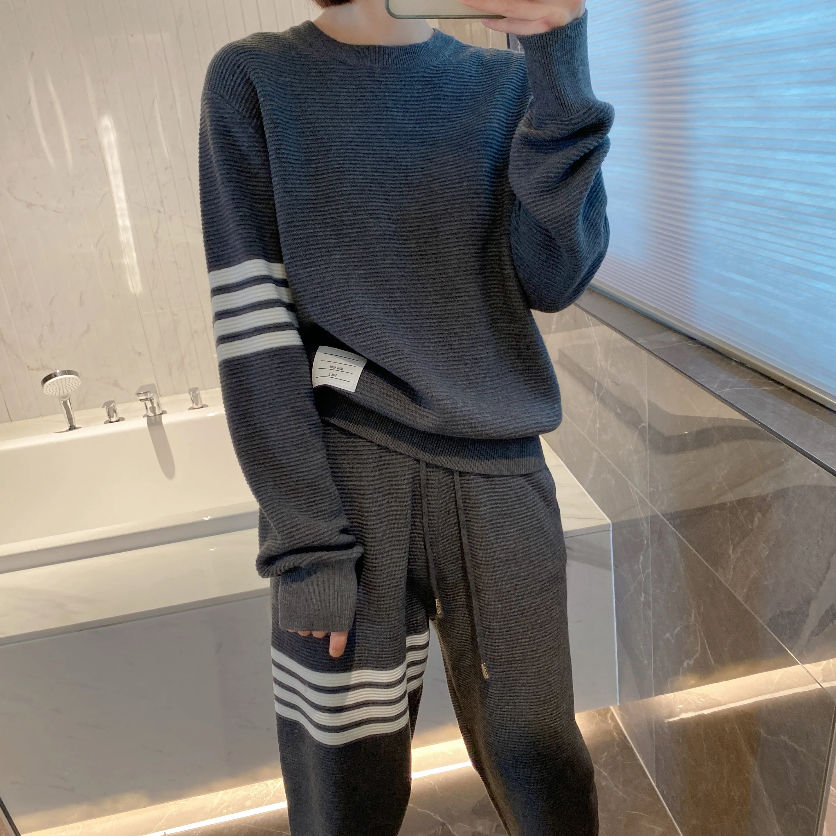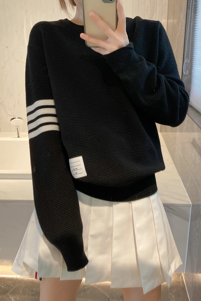 «Korean Classic High-end TB Long Sleeve Round Neck Pullover College Style Wool Knitted Sweater Horizontal Stripe Four Bar Top» по лучшей цене на рынке! Всего за 56$ (5320рублей)