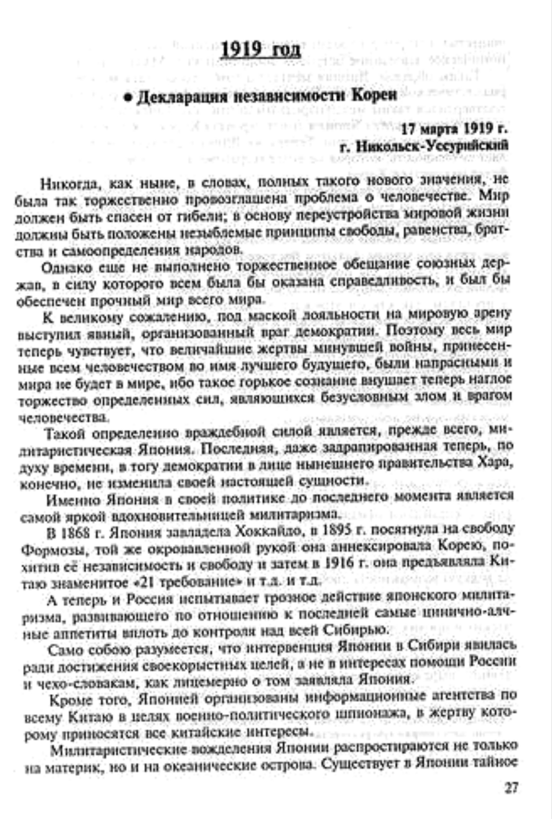 1919 - Корейцы, проживавшие в российском Приморье, выступили в городе Никольске со своей особой Декларацией независимости