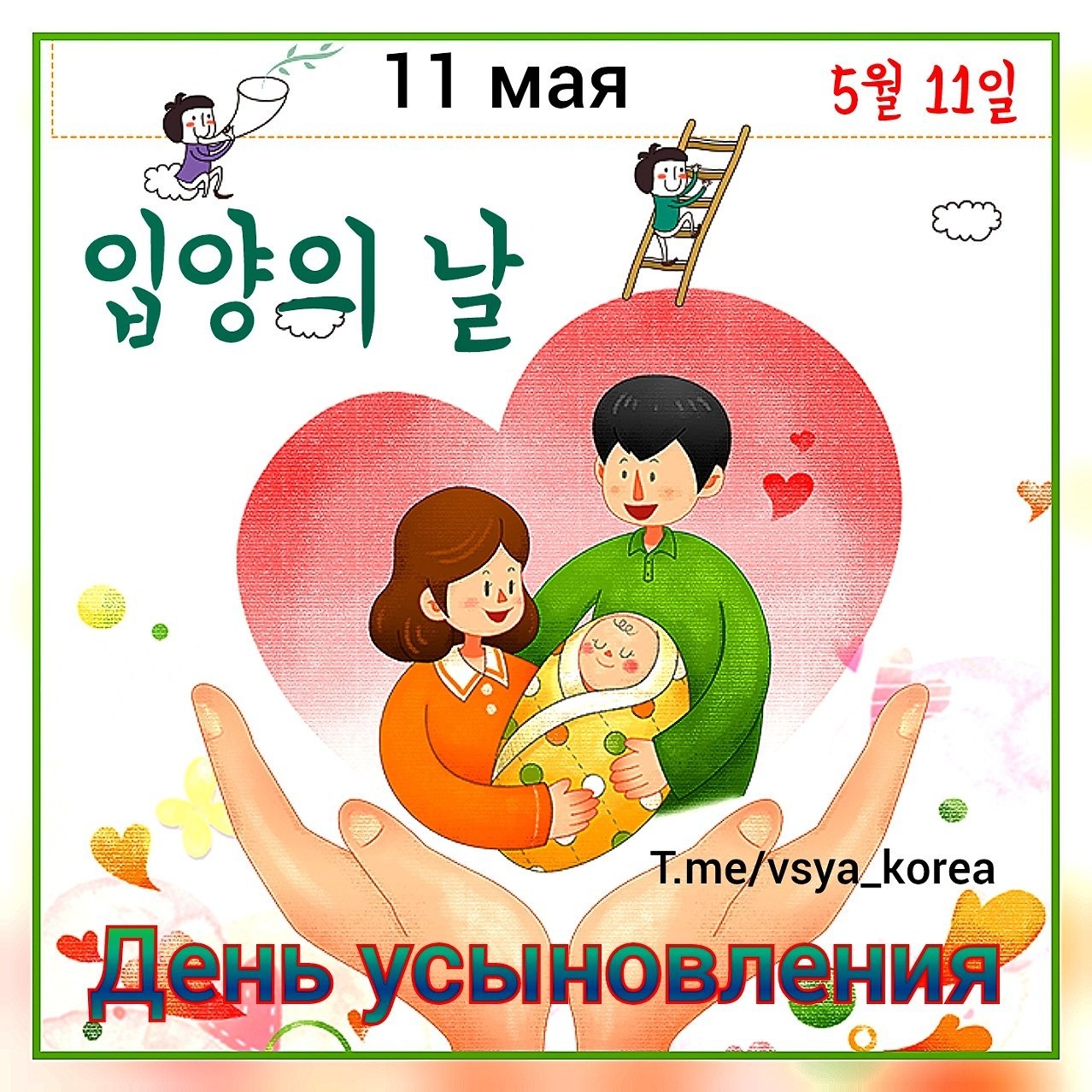 11 мая в Корее отмечают День усыновления (удочерения), цифры в дате которого "1+1" символизируют объединение людей, не связанных кровными узами, в одну семью.