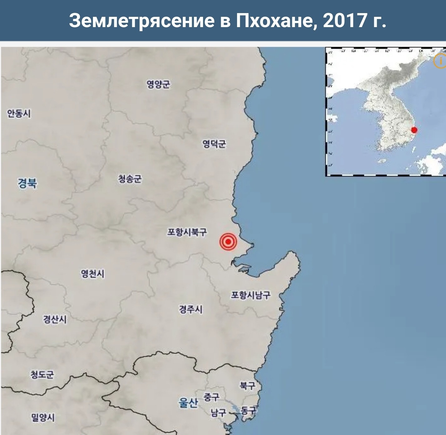 2017 - В юго-восточном городе Пхохан произошло редкое землетрясение магнитудой 5,4, в результате которого были повреждены здания, выбиты стекла и люди выбежали из своих домов. Толчки ощущались вплоть до Сеула, расположенного в сотнях километров от города.