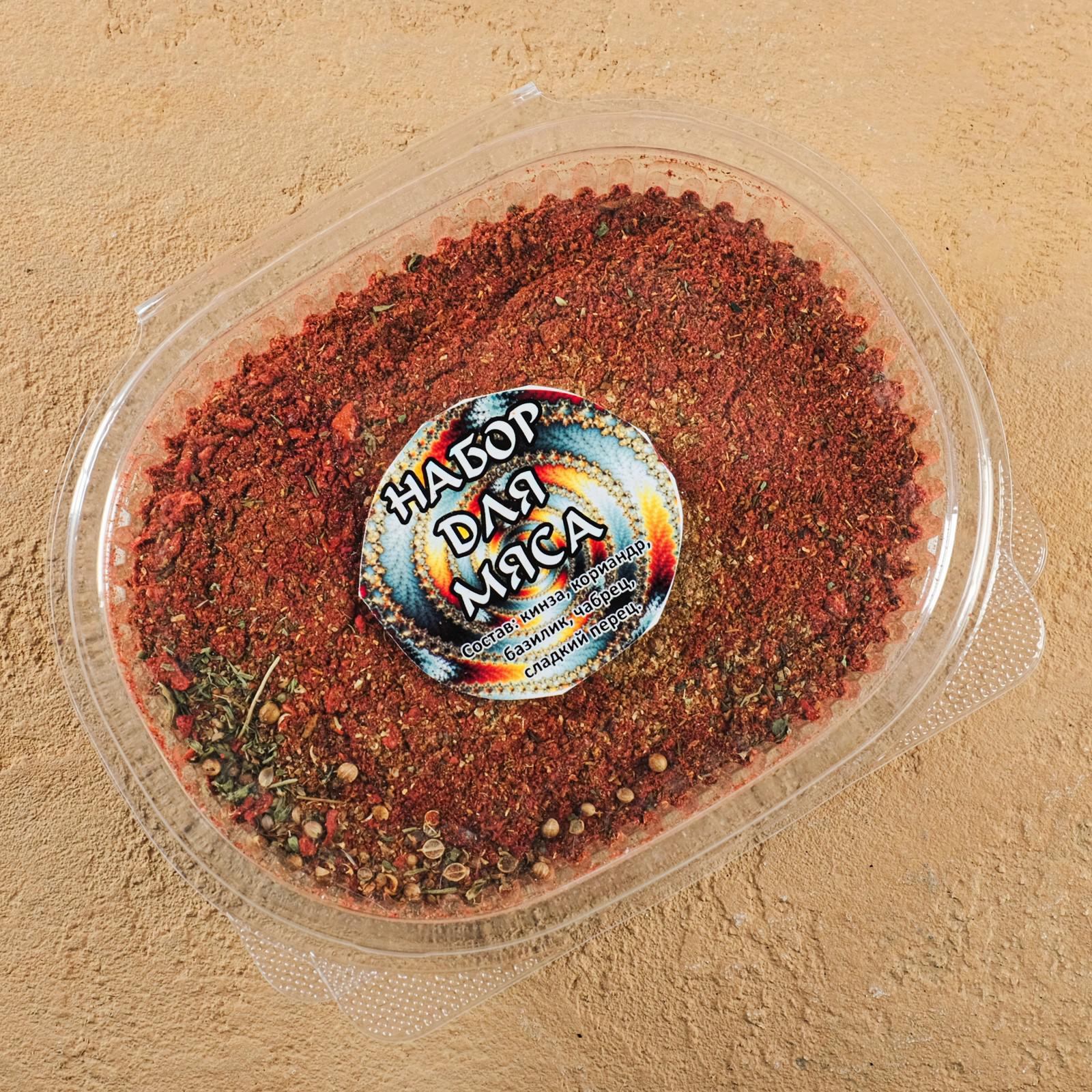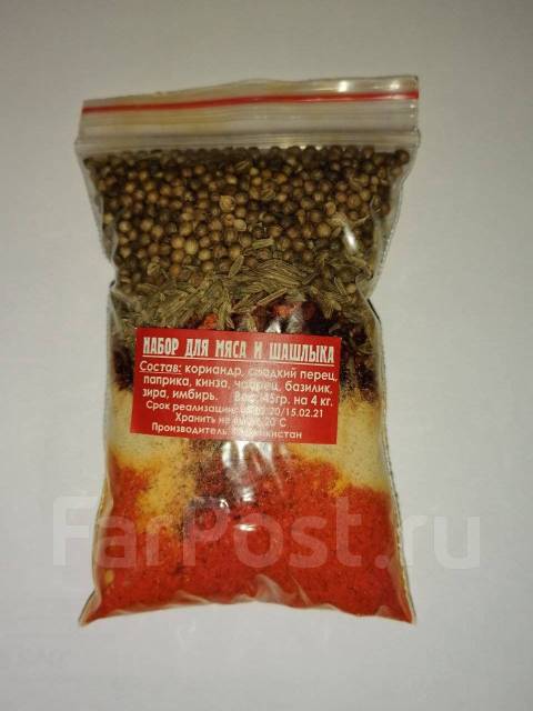 Описание Информация для заказа Приправа «Для мяса» в составе: паприка, перец китайский острый, кориандр, чеснок, тмин, базилик, куркума, укроп, мускатный орех, перец белый молотый, перец чёрный молотый, перец душистый молотый . Отпускается от 100 грамм в бумажной упаковке за 6р . Для любителей пикантного .