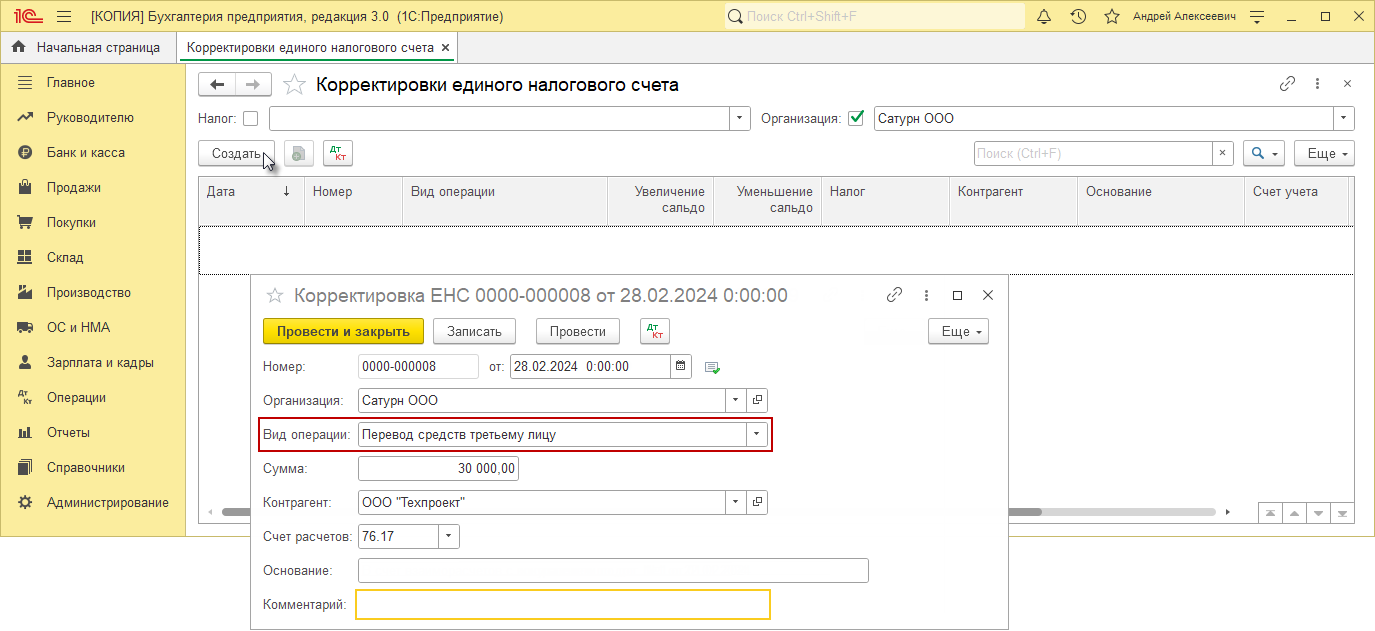 Корректировка енс прочее увеличение сальдо проводки