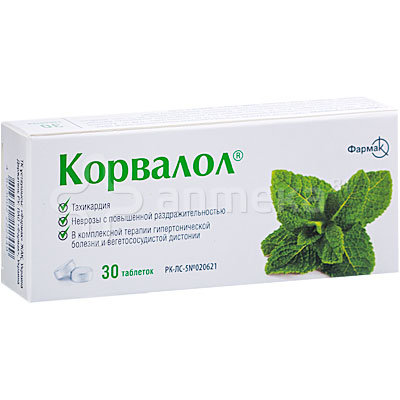 Показания Корвалол таблетки . невроз с повышенной раздражительностью; бессонница; в комплексной терапии при гипертонической болезни и вегетососудистой дистонии; нерезко выраженные спазмы коронарных сосудов, тахикардия; спазмы кишечника, обусловленные . . .