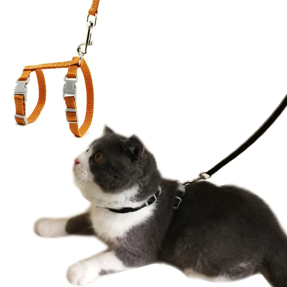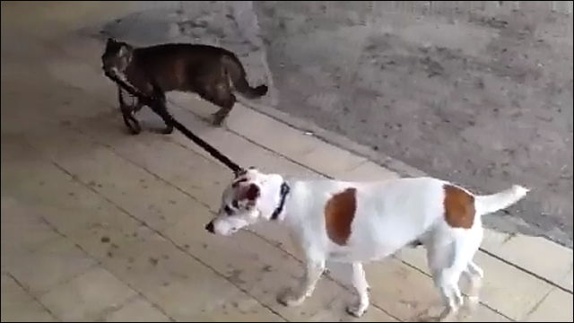 Кошка и собака на поводке