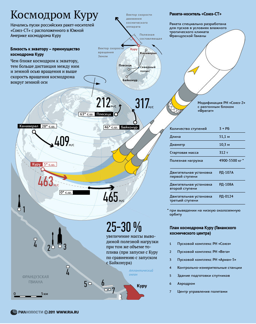 Будущее космодрома Куру являются безоблачным за счет очень выгодного географического положения (близости к экватору) для запусков на наиболее востребованную орбиту (ГСО) .