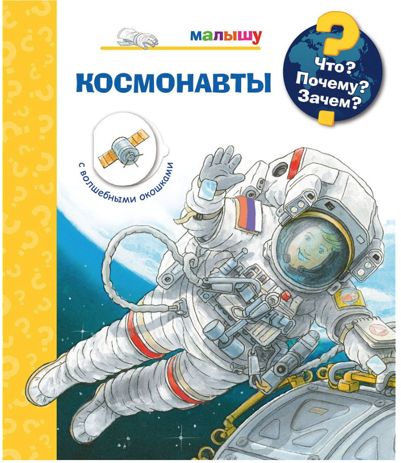 Окошки, яркие иллюстрации и немного информации - секрет успеха у детей 2-3 лет. Плотный картон позволит зачитать до дыр книгу, при этом она не разлетится на мелкие кусочки. Кто такие космонавты, чем они занимаются, как проводят свой день.
