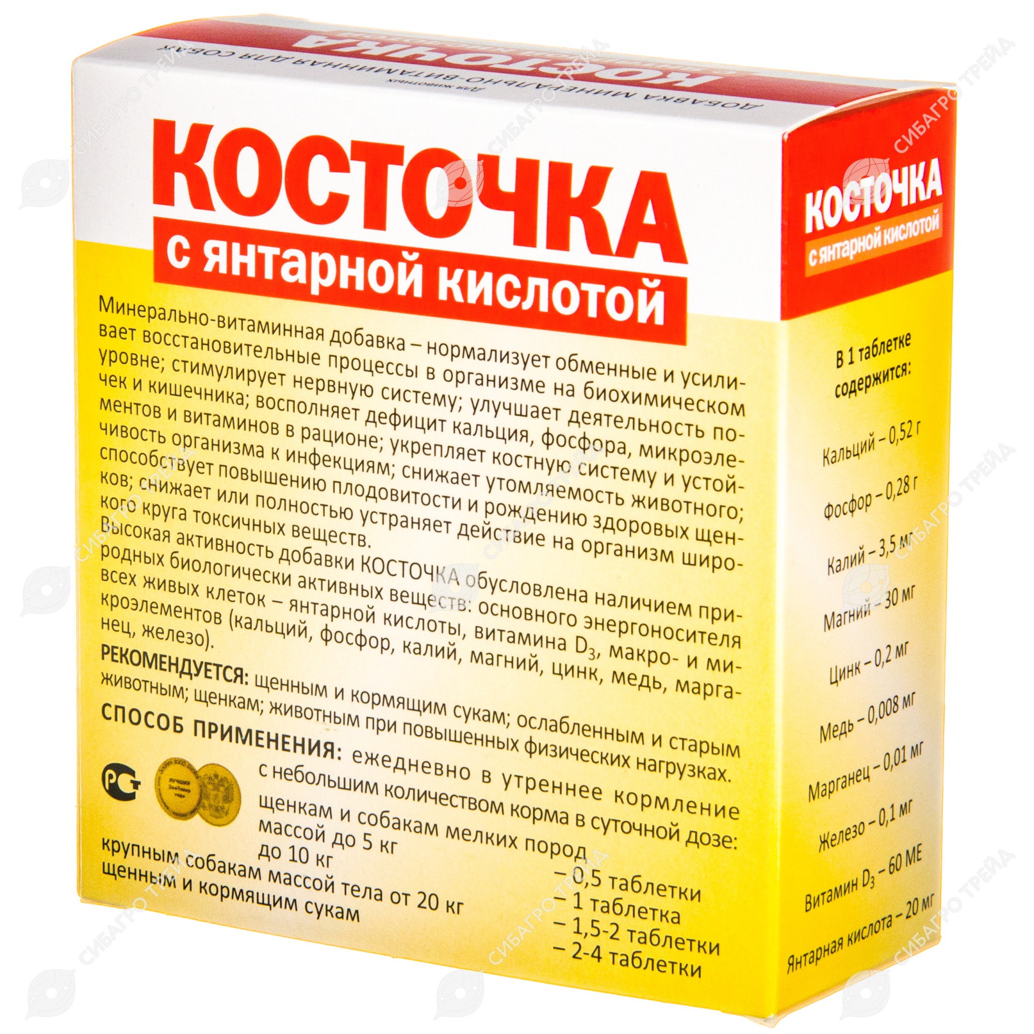 Помимо подобранного в оптимальном соотношении «строительного» материала живого организма - кальция, фосфора, калия, цинка, железа, магния, меди, марганца, кобальта, «Косточка» содержит природные биологические стимуляторы - морскую капусту, янтарную кислоту, пивные дрожжи, антисептик-стимулятор Дорогова . Выпускается «Косточка» в 6 видах: 5 .