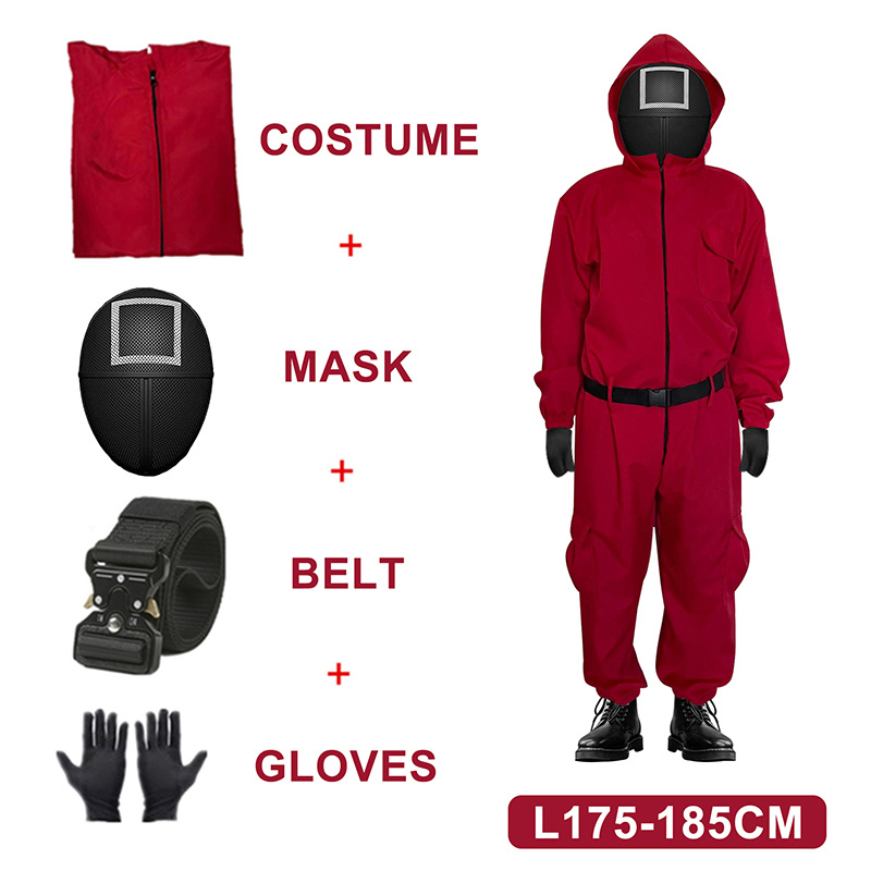 игра в кальмара игра в кальмара Костюмы для косплея, красный комбинезон в стиле игры кальмар, Круглый, шестиугольный, треугольный, квадратный, маска, ремень, аксессуары для Хэллоуина, Наслаждайся Бесплатная доставка . . .