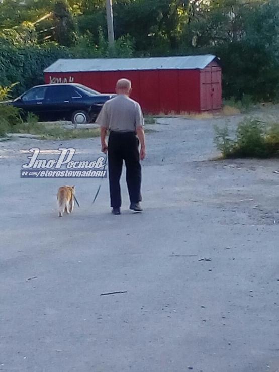 Хозяин гуляет во дворе с котом, привязанным на поводок