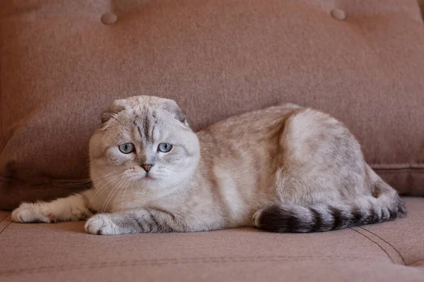 Серое Шотландское Мяуканье Кошки Диване Ноутбуком . . .