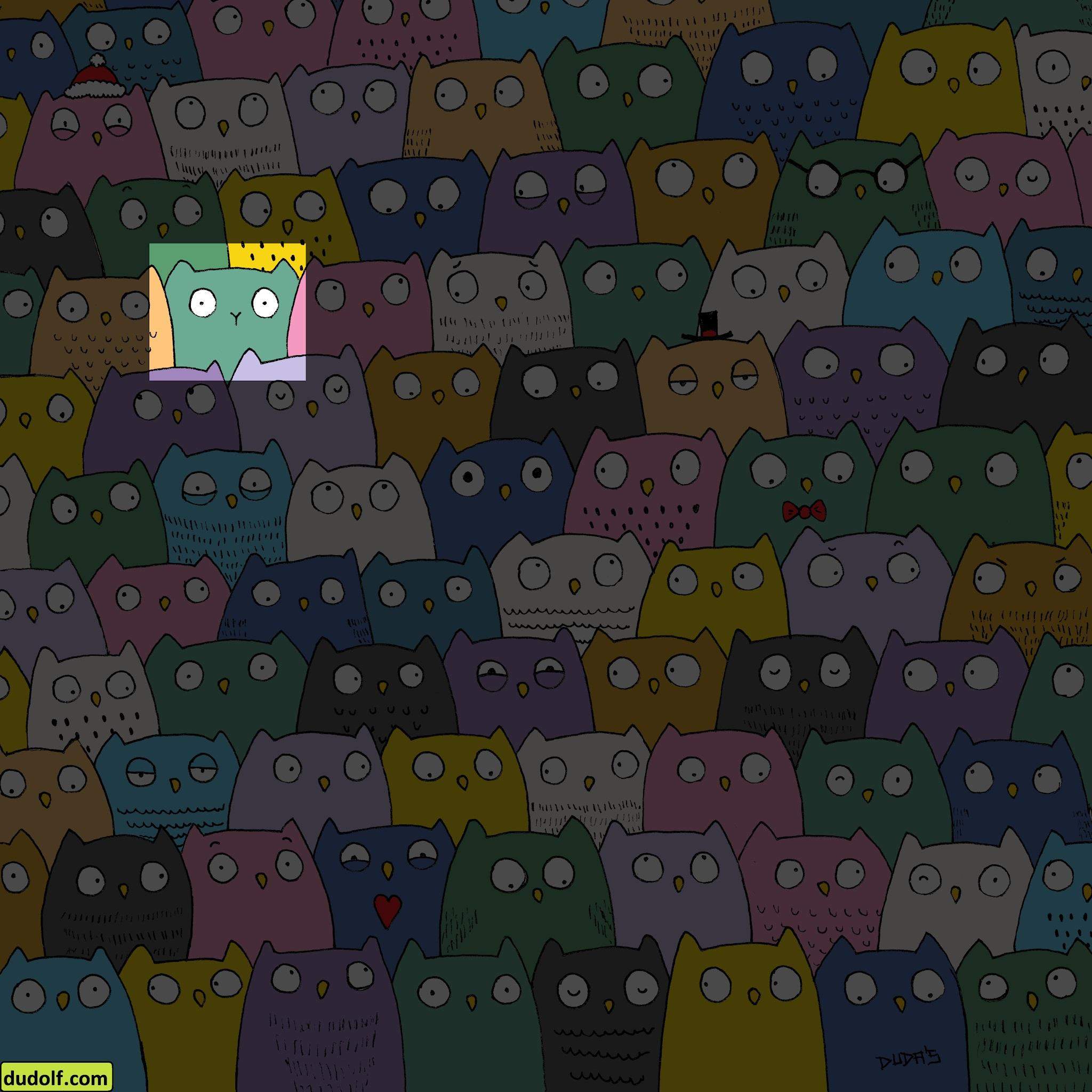 Перед вами полчище сов, которые успешно скрывают кошку . Перед вами полчище сов, которые успешно скрывают кошку . Как правило, человеку нужно около двух минут, чтобы найти животное Теперь вы во всеоружии и просто не сможете пропустить кота на этой картинке!