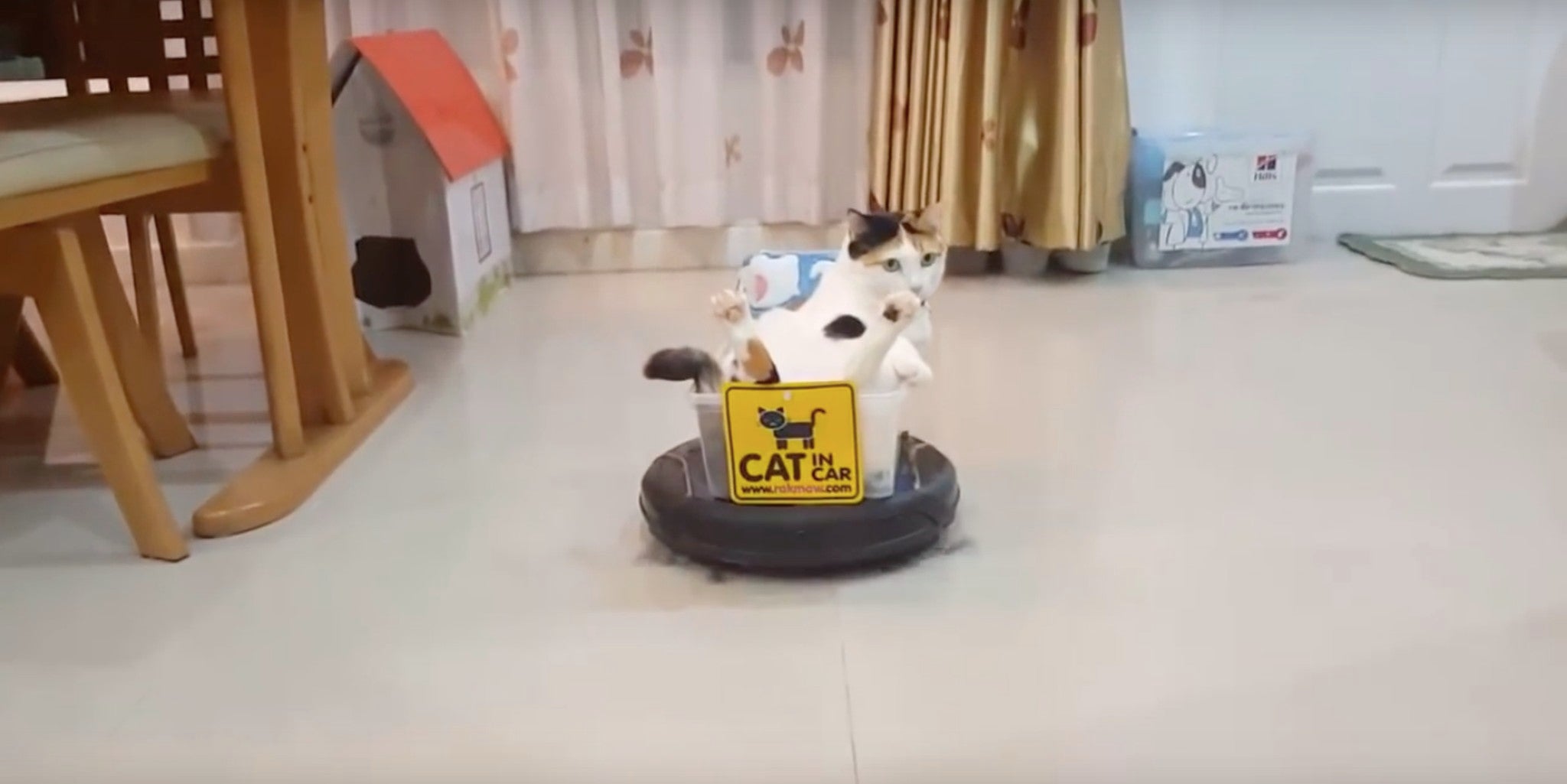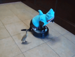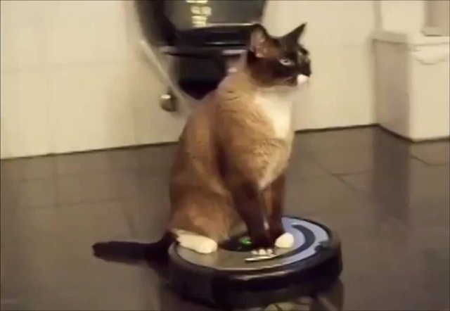 Кот катается на пылесосе