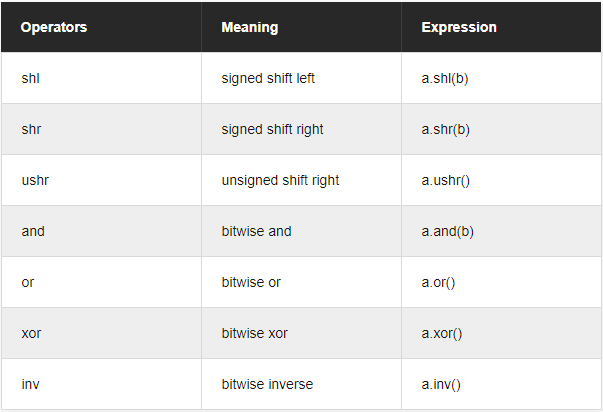 5 signed shift left by 1 bit: 10 10 signed shift right by 2 bits: : 2 12 unsigned shift right by 2 bits: 3 36 bitwise and 22: 4 36 bitwise or 22: 54 36 bitwise xor 22: 50 14 bitwise inverse is: -15