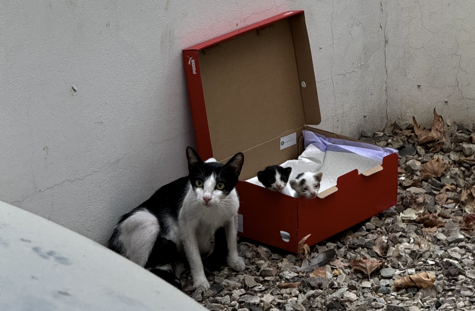 А еще оказывается если много трогать маленьких котят, то мать-кошка может от них отказаться из-за слишком сильного чужого запаха. Поэтому мы посадили их обратно в коробку от найков и отправились на поиски кошачьей матери.