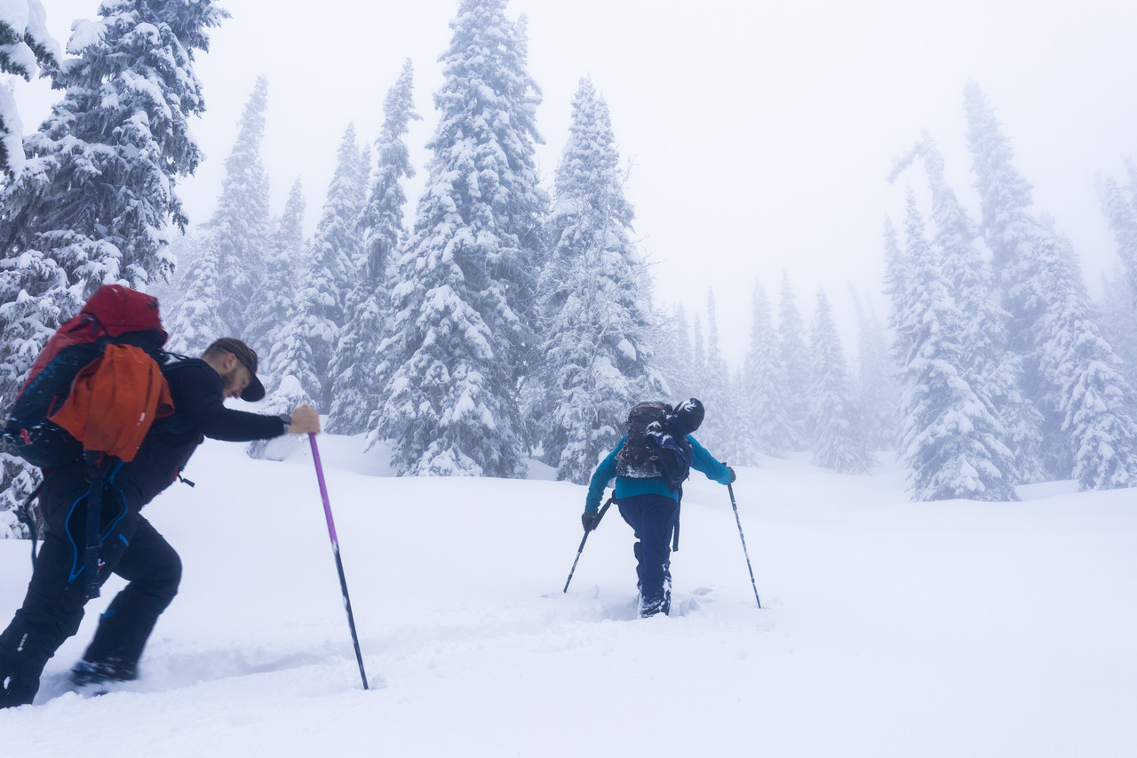 Всю ночь шел снег, и мы решили собрать лагерь и переместится в небольшую избушку – место, где нас на следующий день должен забрать снегоход, но перед этим пошли исследовать Подкозенок – небольшую покрытую лесом горку, ближайший склон к нашему лагерю. По картам и спутниковым снимкам все должно было быть легко и понятно, но южные склоны оказались сильно интереснее, чем представлялось из дома – достаточный уклон, очень много рельефа, к концу спуска тоже все собирается в ручьи и небольшие ущелья, но есть опасность выехать на скальный сброс или ледопад, учитывая удаленность от цивилизации, никто особо не рисковал и выбирали более спокойные линии, но даже этого хватило для веселья. Внизу снег уже был сильно мокрым, если на высоте еще были зимние кондиции, то здесь уже была весна в самом разгаре.