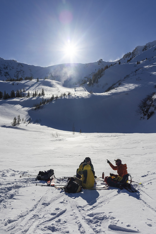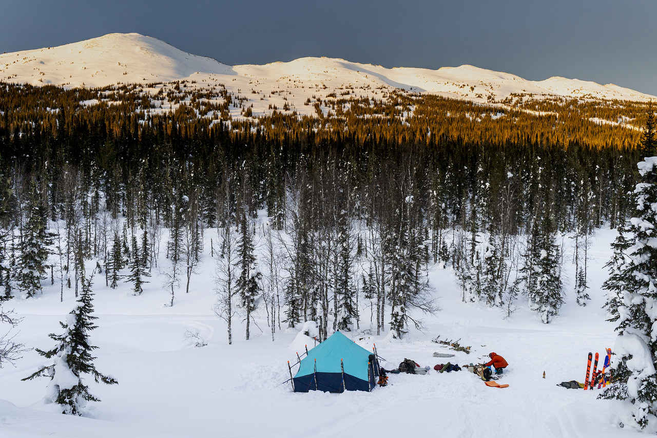 Но нужно начать все с начала – год назад Алексей в чате или где то вечером в избушке предложил поехать в лес с палаткой куда то за Курагино, тогда его никто не поддержал, но мысль эта поселилась в голове и за год из идеи перешла в категорию «цель». Активное планирование началось где-то за полгода, начали искать варианты зимних палаток с печкой, нашли контакты местных туристов со снегоходом, определились с заброской, местом лагеря, спутниковой связью и интересующими местами для спусков. И вот мы вчетвером (Паша, Алексей, Женя, Валентин) едем 500 километров на машине из Красноярска до озера Тиберкуль, чтобы потом проехать 20 километров на снегоходе и пройти 3 километра на скитуре. 11 часов следующего дня и у нас уже разбит лагерь – установлена палатка, напилены дрова, откопан ручей с водой. Дома с дивана это все казалось сильно сложнее, чем оказалось на самом деле. Особый интерес у нас вызывали 10 северных цирков – по картам и снимкам читались сильные уклоны и интересные скальные кулуары, поэтому первым делом пошли на вершину, но поднявшись наверх увидели, что снег и по мягкости и количеству оставляет желать лучшего.